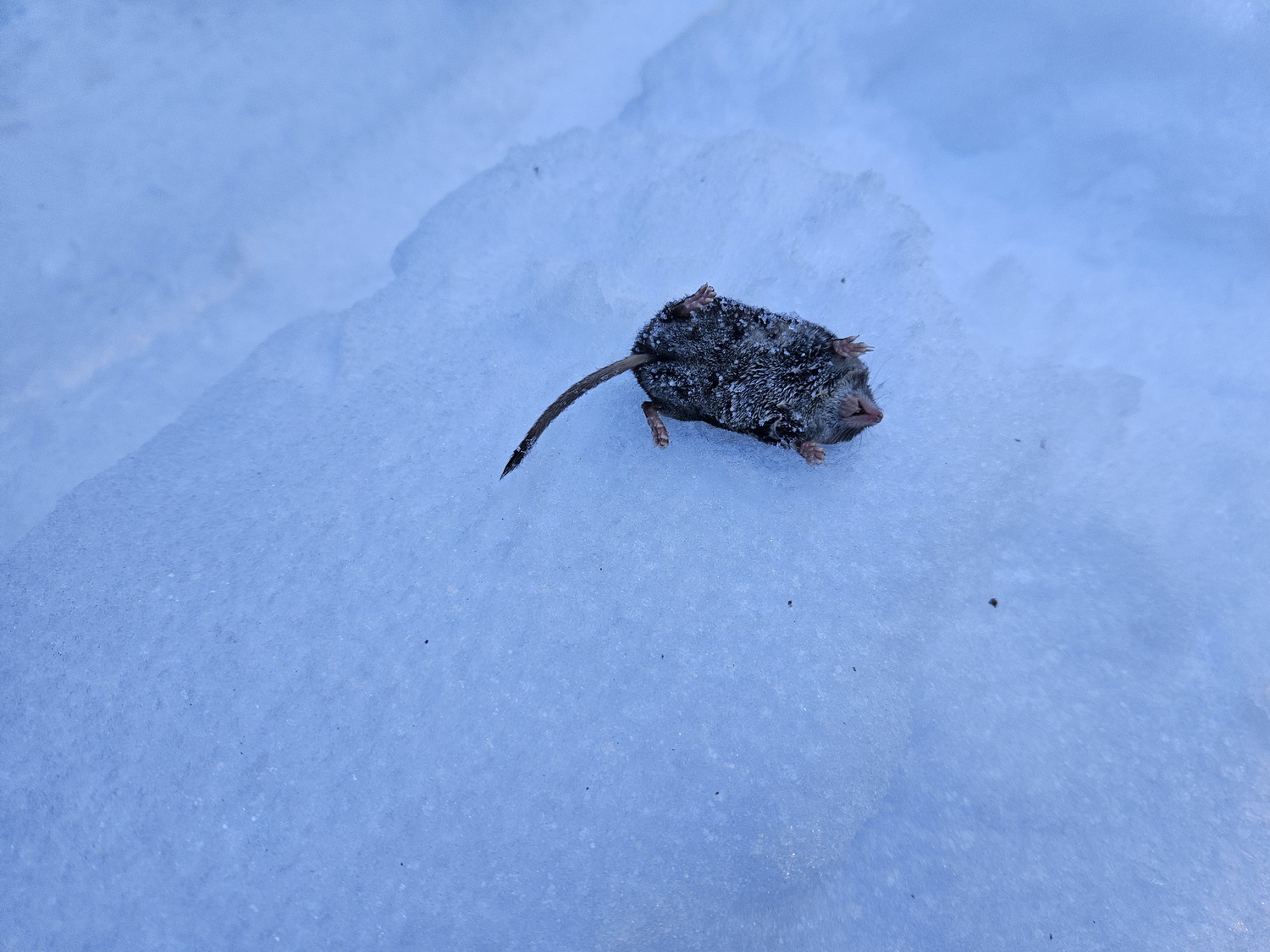 Po sesji z „leśnym stworem”, który wyłonił się z gęstwiny, ruszyliśmy dalej. Niestety po drodze napotkaliśmy pierwszą ofiarę mrozu – ryjówkę aksamitną. Te zwierzęta muszą jeść niemal bez przerwy, aby przetrwać, co przy takiej pogodzie jest ekstremalnie trudne.
