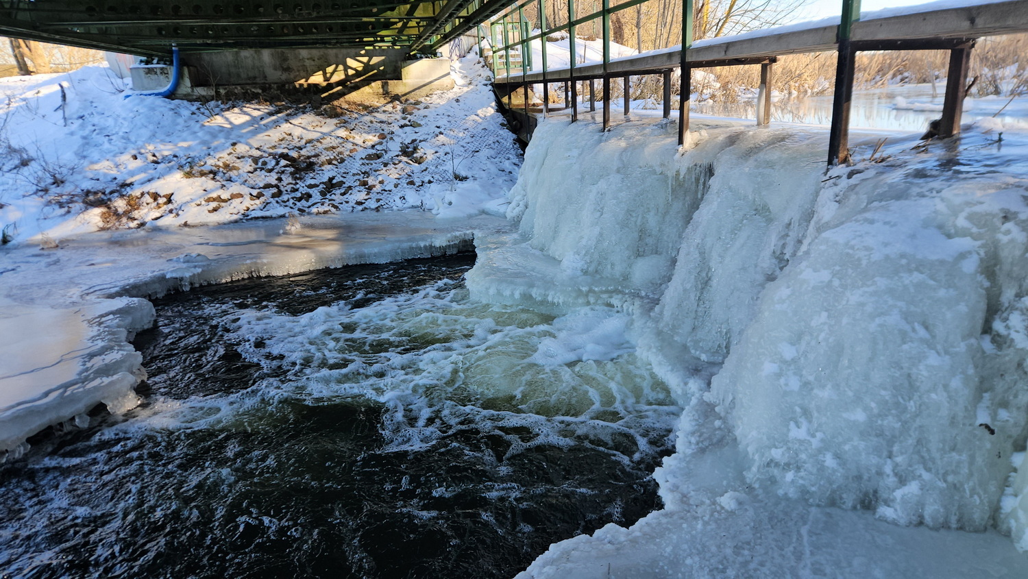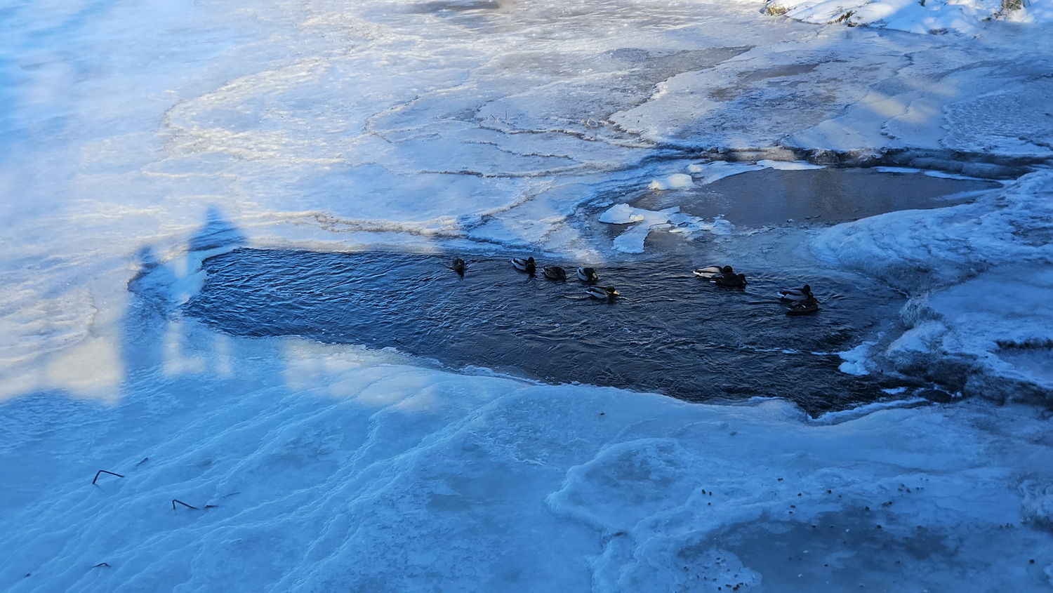 Po sesji z alpakami poszliśmy zobaczyć słynne „zamarznięte wodospady” w Supraślu. Robiły ogromne wrażenie. Na rzece Supraśl dostrzegliśmy też kaczki, które znalazły sobie skrawek niezamarzniętej wody do pływania.
